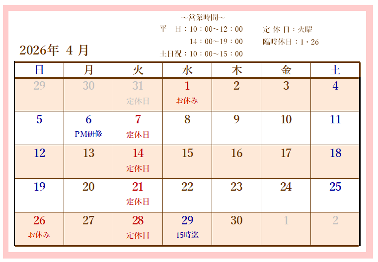 2026年4月の営業予定をお知らせいたします。